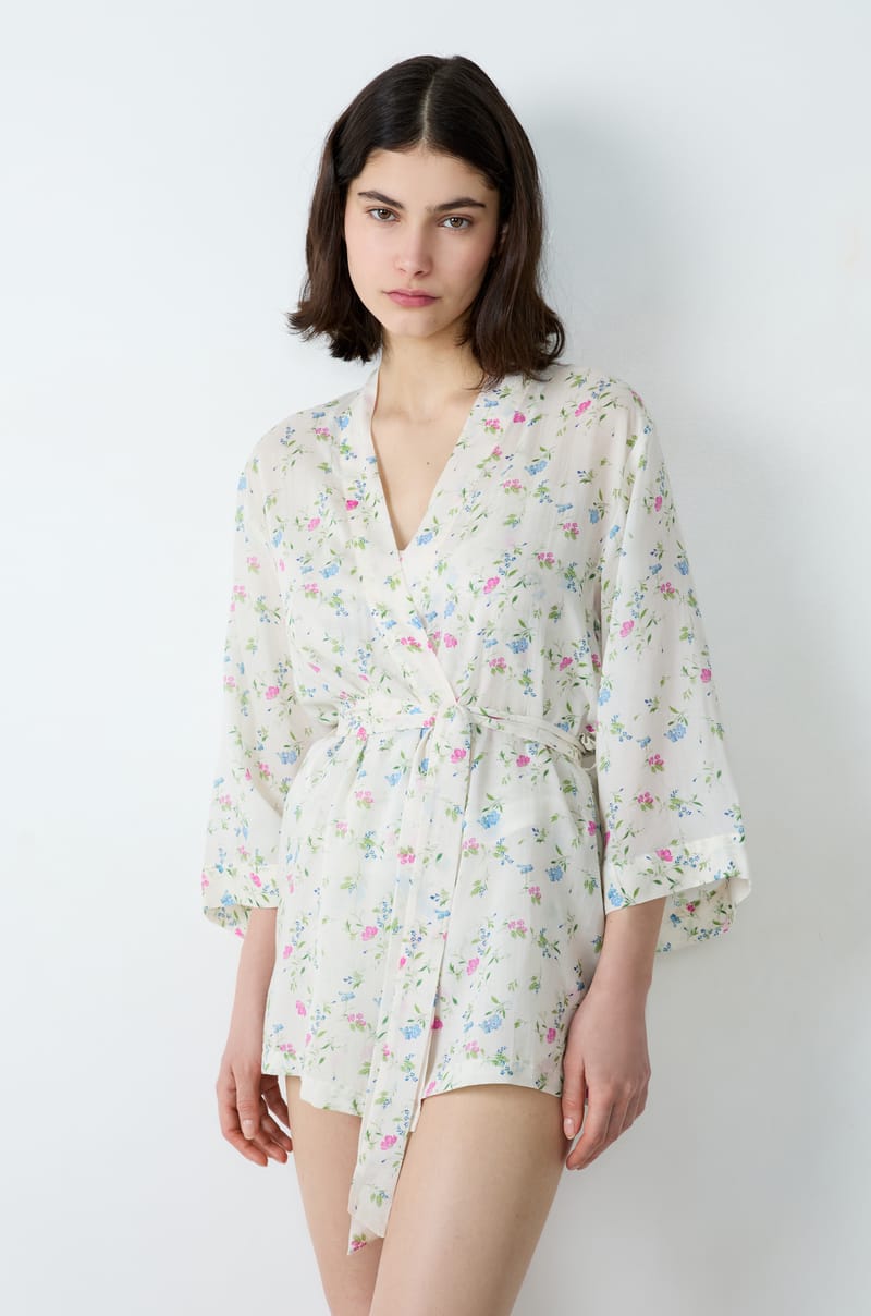 Květinový potisk zdobí tento jemně saténový župan. Se svými poutky a integrovaným páskem tvaruje siluetu. Noste přes sladěnou soupravu.